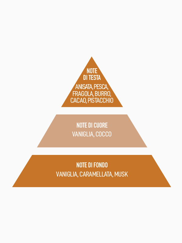 Tra le note golose più ricercate e desiderate, la fragranza rappresenta la nuova tendenza olfattiva da gustare che crea un’esperienza sensoriale estremamente piacevole e confortante. Tra i suoi accordi troviamo un tripudio di pistacchio, burro, nocciola e frutta accompagnati da caramello e vaniglia. Un profumo che accende il sorriso e la spensieratezza. La fragranza gourmand può infondere un senso di gioia e richiamare i teneri e felici ricordi d’infanzia come i negozi di dolciumi o le visite ai luna park. Quando si sceglie un gourmand, si attraversa un viaggio che coinvolge le emozioni, il cuore e i ricordi.